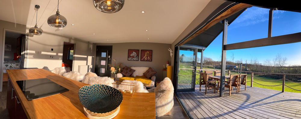 Cabins are individually boho styled with everything you could need for the most comfortable, self-catered stay. Central heating and super insulation bring winter warmth and summer cool. Views of the devon countryside stars and lake are amazing. Private car parking is standard.